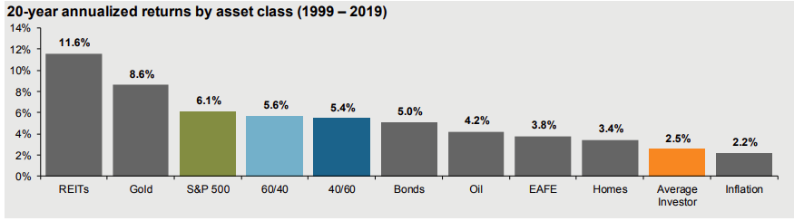 Studies conducted have shown that the average investor’s returns have annualized 2.5% over the 20-year time frame from 1999-2019, despite annualized returns of 6.1% for the S&P 500 and 5.6% for a 60/40 portfolio over the same time frame. This is primarily due to the average investor’s decisions to inappropriately reallocate their portfolio on a reactionary basis during extreme market conditions, thereby significantly damaging portfolio returns in the process, i.e. buying high and selling low. Understanding an individual’s risk tolerance and structuring a portfolio with the appropriate asset allocation before volatility flares up should prevent this outcome.