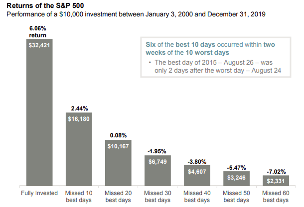 As depicted in the chart above, the S&P 500 has generated positive calendar year returns in 30 of the last 40 years notwithstanding the associated volatility. The chart below demonstrates the perils of market timing and the damaging effect on long-term rates of return.