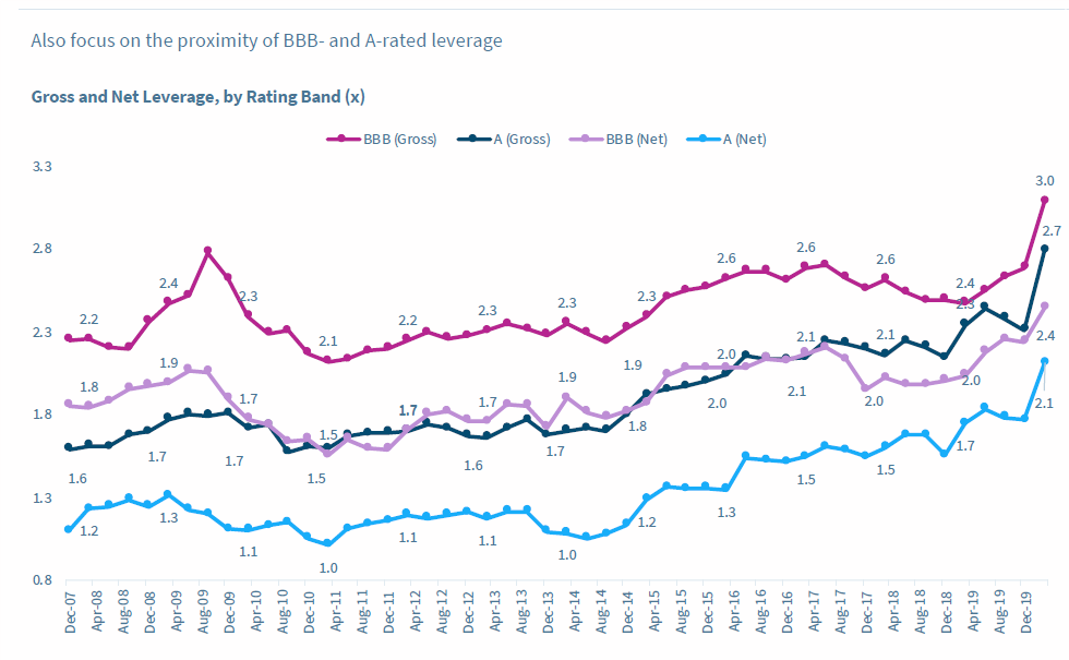 While research can unearth examples of companies with continued opportunity, the overall market remains nervous and stretched, especially at the BBB rating level. Over the past 20 years, the overall index has increased from $1.1 trillion in 1999 to $7.1 trillion today. At the same time, the percentage of BBB rated credits in the index has increased, as illustrated by Chart 1, from 34% of the index in 1999 to 50% today. As corporations have issued record levels of debt, their leverage ratios have also increased. As Chart 2 shows, this ratio has increased faster for BBB rated companies. Passive investment products, such as ETFs, have had to increase their allocations to match the indices, which may pose unwanted risk to portfolios if a wave of downgrades occurs. We have no exposure in any of our strategies to these passive ETFs.