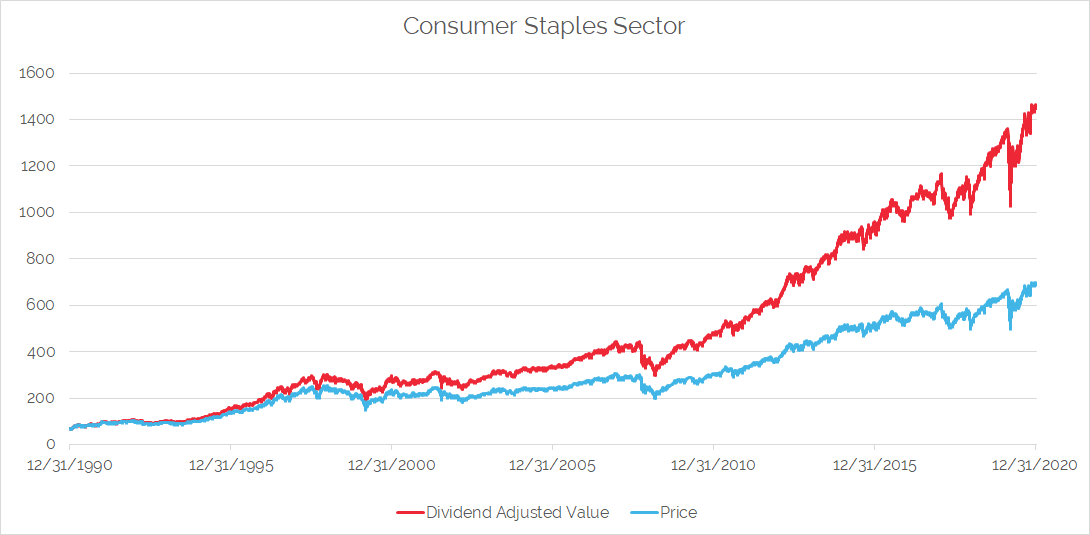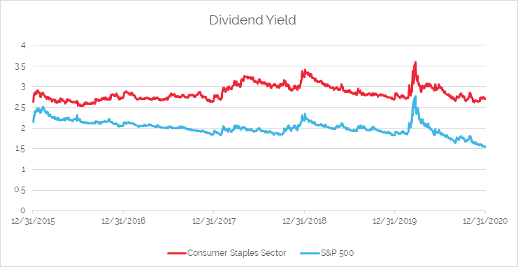 An effect of the typical low-growth that most Staples companies exhibit is that most are stable dividend payers, and many have a long history of consistent dividend growth. As of December 2020, the Staples sector dividend yield was 2.7% versus the S&P 500 at 1.5%.