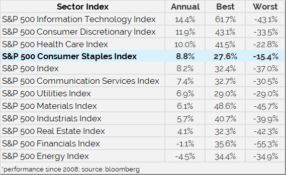 The Staples sector makes up for a lack of attractive growth characteristics with reliable profits, steady cash flow generation, and by having conservative balance sheets with stable dividends. The annualized total return for Staples puts it among the best performing sectors over the long term. In addition, during periods of turmoil, Staples has offered the lowest drawdown and has preserved the most capital versus peers.