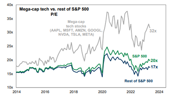 In other words, as shown in the graphic below, the price-to-earnings (P/E) ratio of the “magnificent seven” (Apple, Microsoft, Amazon, Alphabet/Google, Nvidia, Tesla, Meta/Facebook) tech-related stocks is expensive at 32x, while the rest of the S&P 500 is more reasonably valued at 17x.