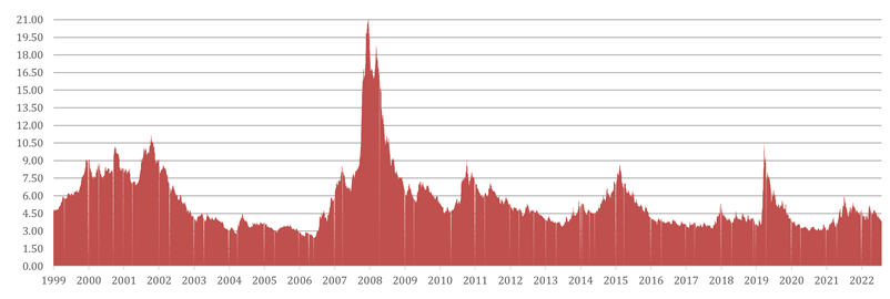 The macroeconomic nervousness embodied by the inverted US Treasury yield curve shape is not evident in credit spreads at all. Corporate debt spreads remain tight and without fear of any immediate or widespread credit risk, as shown in the graph below. Many companies wisely cleaned up balance sheets, extended debt maturities and/or generally deleveraged during the era of near-zero interest rates. There is also a growing amount of capital available in private credit markets as a possible lifeline for those in more unique or precarious financing positions. We have limited exposure in lower rated credit and are waiting for better entry opportunities.