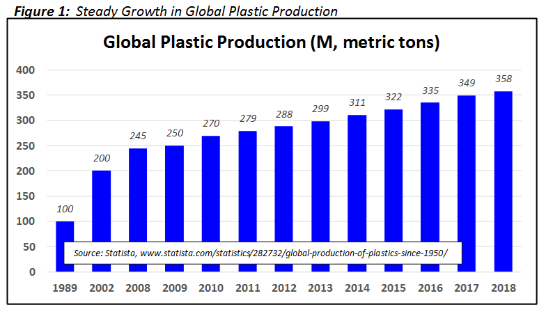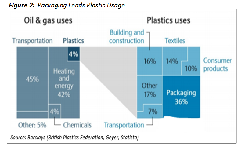 To be clear, plastic has played a prominent role in advancing medical science, transportation, and food safety among its many positive impacts. The after effect of those many uses in the form of plastic waste, however, has proven to be a challenge that the world is having difficulty solving. The complex structure of plastic makes it nearly impervious to decomposition, unlike most other forms of everyday waste; rigid plastic can take up to 1,000 years to breakdown in a landfill. The US generates roughly 30-40M tons of collected plastic waste annually, according to the EPA, but less than 10% is recycled while 75% is placed in landfills with the remainder incinerated. Production continues to increase at a steady rate (see Figure 1), however, essentially assuring that plastic waste will continue to pile up across the world. Packaging is the largest end-use for plastic (see Figure 2) thanks in large part to the rise of throw-away single-use containers, many of which are used for food and beverage products.