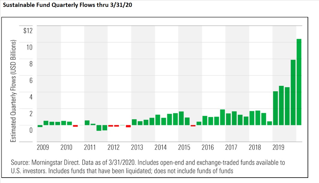 As the country continues to be quarantined during the COVID-19 pandemic, stock mutual funds with an ESG mandate have continued to see an inflow of new assets. As the chart below shows, the highest months for inflows have come in the last two quarters as COVID-19 brings a renewed awareness of global citizenship, health, wellness, financial stewardship and environmental responsibility.